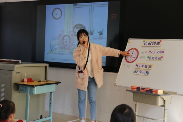 活動開始,首先由開發區第四小學章希老師講授一年級數學課《認識鐘表》,章老師非常重視學生說的能力,高度完成了本節課的教學目標,通過讓學生說一說,撥一撥,寫一寫,既讓學生親身體驗數學來源于生活,又能幫助學生積累活動經驗。