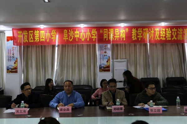 同課異構,協同并進!為了促進教師專業成長和數學科組建設與發展,2019年12月3日,阜沙中心小學數學組與開發區第四小學數學組共同在開發區第四小學開展同課異構教學研討及經驗交流活動。出席活動的有兩校的校長梁業昌、鄭碩果,開發區中心教研組成員張立超以及兩校全體數學老師。