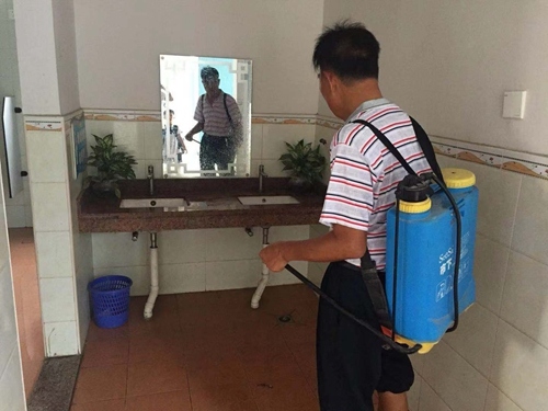 當日,學校組織后勤人員對校園環(huán)境進行大掃除,全面清理積水和雜物,特別是廁所、下水道、操場角落、垃圾桶、花壇等衛(wèi)生死角,以消除蚊蟲的孳生條件。孳生地的清理強調全方位展開,反復檢查補漏。另外,學校還利用化學藥物消殺蚊蟲,對校園各個角落進行噴藥消毒,采取專業(yè)的方式從源頭切斷蚊蟲孳生。