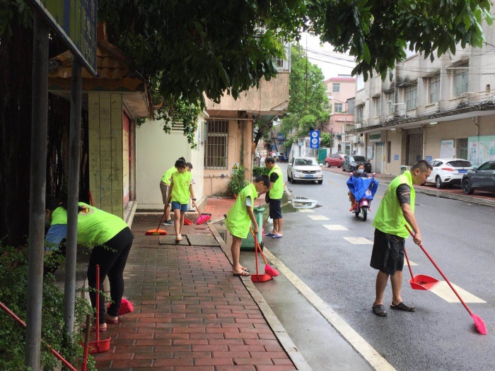 當天早上,盡管天空飄著小雨,老師、家長志愿者們依然準時在學校門口集中,帶上鏟子、掃把、垃圾車等清理工具深入學校及周圍街道,認真清掃學校與社區周圍鄰居道路兩側的每一個死角。志愿者們不怕臟、不怕累,分工合作,志愿服務進行得井然有序。部分志愿者拿著剪子、夾子、掃帚、垃圾鏟清理校園花圃里沉積的枯枝落葉、雜草、垃圾等。而有的志愿者前往學校周邊,認真地撿拾路人丟棄的碎紙屑、塑料袋、煙頭、生活垃圾,合力清理堆放在道路兩側的堆積物,如花盆、水泥、砂石等,確保校園周邊環境干凈整潔,也營造干凈整潔的人居衛生。