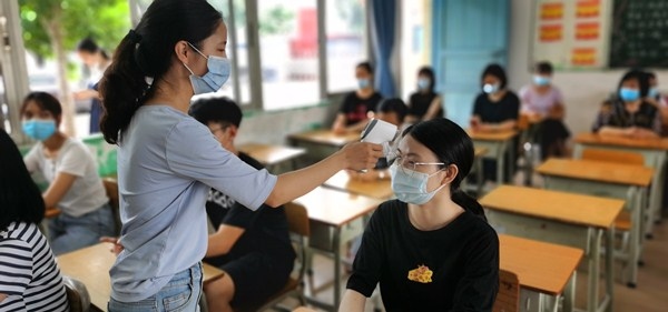 演練主要分為兩個環節。第一環節,教師們扮演學生,戴好口罩,間隔1米,排好隊,錯峰等候入校。進校前,接受體溫檢測,體溫正常則直接進入校園。當體溫異常時,檢測員報告值日行政,并將其帶到隔離區,由隔離區的校醫監管,同時聯系班主任,由其通知家長接走,疫情防控小組負責人根據實際情況反饋信息到相關部門。最后消毒人員對相應區域進行消毒。第二環節,上課期間,如果有學生感到不舒服,任課教師對其進行體溫檢測,確定體溫異常的,將其帶到樓道空曠處并報告班主任及校醫,由校醫將該生帶到隔離觀察室觀察,做好三次檢測,并登記相關信息匯報疫情防控領導小組,由小組負責人撥打120等候處置。接著,班主任將其他學生轉移至備用教室,并做好學生安撫工作。