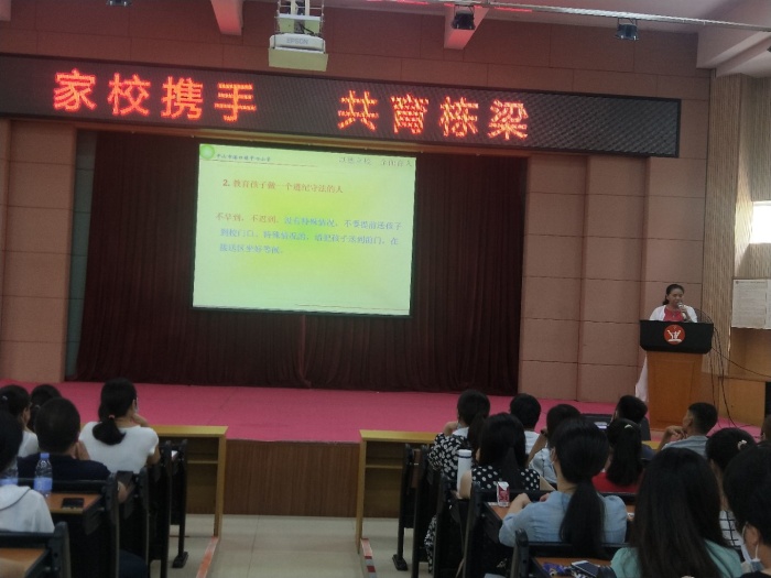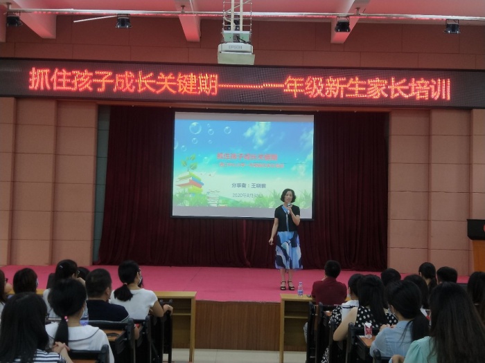 與此同時,另一邊的家長培訓會議也在學校禮堂如火如荼地開展中。本次新生家長培訓,學校邀請了中山市婦聯家庭教育指導服務中心主任王曉君女士給家長們作了題為《抓住孩子成長關鍵期》的講座。王主任深入分析了一年級孩子的特點,從一年級新生家長最關心的問題入手,指導家長如何抓住一年級孩子成長的關鍵期進行家庭教育。