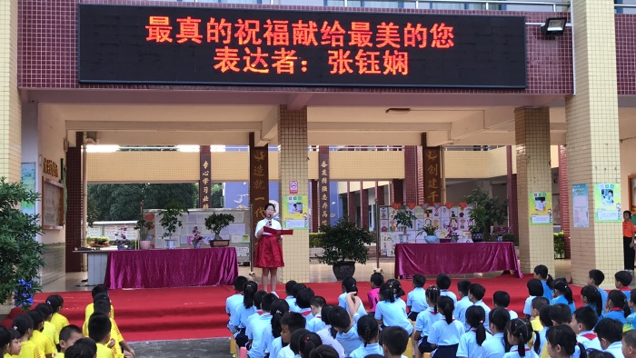本次活動(dòng)由六(1)班的梁智煌和六(2)班羅紫晴同學(xué)主持,全校師生共同參加了此次活動(dòng)。在活動(dòng)中,首先由秦聲通校長(zhǎng)發(fā)表致辭,他向?qū)W校的老師們送上了節(jié)日的問(wèn)候,并向長(zhǎng)期以來(lái)堅(jiān)守一線(xiàn)辛勤工作的老師們表示了真摯的感謝與深切的祝福。接著,少先隊(duì)員代表在熱烈的掌聲中為敬愛(ài)的老師們獻(xiàn)上鮮花、賀卡和繪畫(huà),由此表示對(duì)老師們不盡的感恩與愛(ài)戴,老師們臉上綻放出慈愛(ài)又幸福的笑容,眼中流露出感動(dòng)與驕傲的目光。隨后,由黃玉霞老師帶領(lǐng)語(yǔ)文科級(jí)組成員一起飽含感情地朗誦了詩(shī)歌《愿做您生命中的貴人》,將身為教師的自豪之情娓娓道出。然后,中年級(jí)學(xué)生代表黃曉彤、蔡平等同學(xué)帶來(lái)詩(shī)朗誦《尊師重教,感恩師情》,表達(dá)對(duì)教師的敬意。再由,高年級(jí)學(xué)生代表張鈺嫻送上《寫(xiě)給老師的一封信》表達(dá)了每位學(xué)生對(duì)老師們崇高的敬意和深刻的愛(ài)意。最后,全體學(xué)生合唱一首《老師》,把感恩之心送給敬愛(ài)的老師們,并向全體老師道謝“老師,您辛苦了”。在一片歡樂(lè)與感動(dòng)中,“感恩教育”的教師節(jié)活動(dòng)圓滿(mǎn)拉下帷幕。