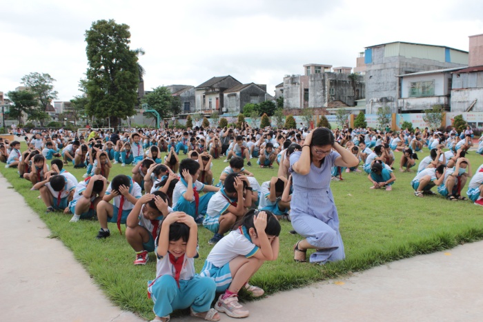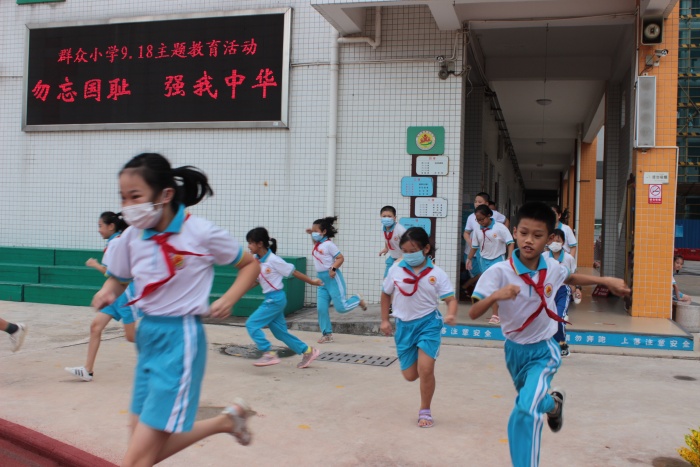 “嗚——嗚——”隨著防空警報響起,全體學生在老師的指揮下,迅速進入應急狀態,有序緊急疏散學生。所有學生按照防火逃生演練路線,迅速而有序地通過各樓層疏散撤離到學校操場上。