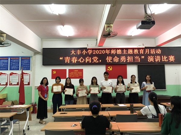為了進一步加強師德師風建設,全面提升教師思想政治素質和職業道德水平,努力造就一支師德高尚、業務精湛、充滿活力的高素質教師隊伍,10月12日下午,大豐小學結合“不忘初心,牢記使命”師德建設主題教育月活動舉行了一次“青春心向黨,使命勇擔當”的演講比賽。