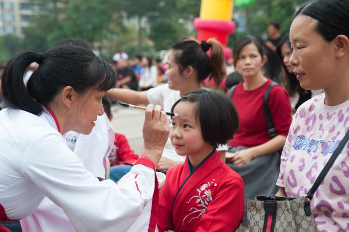古人云:“童蒙之學,始于衣冠;先正衣冠,后明事理”。家長們首先為孩子們整理衣冠,使孩子心中有了塑造清明心智的第一意識。接著,中心小學垂髫學童拱手拜孔子像,鞠躬敬老師,謝師恩。資深老師們逐個為孩子們點朱砂,眉心之間輕輕一摁,一點朱砂如智慧天眼印在孩子們的額頭上,寓意孩子們踏入智慧啟迪的大門。帶著對未來的無限向往,孩子們在激昂鏗鏘的鼓聲中擊鼓明志,告別蒙昧,揚帆起航。學校肖煒林老師為孩子們示范書寫“人”字。家長們握著孩子的手,飽蘸濃墨,在紙張上一撇一捺共同寫下一個“人”字,希望每個孩子都能盡其一生去認真書寫自己的人生篇章。