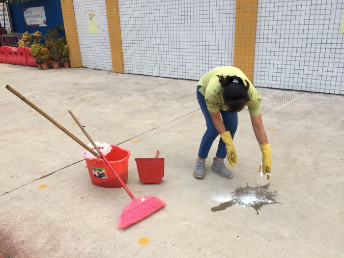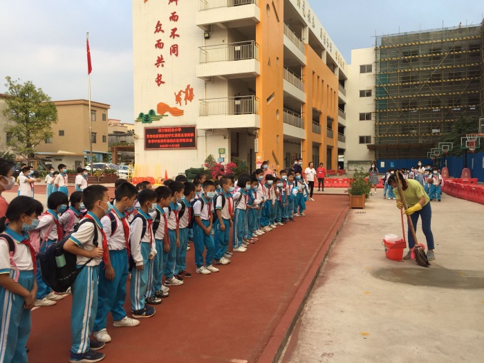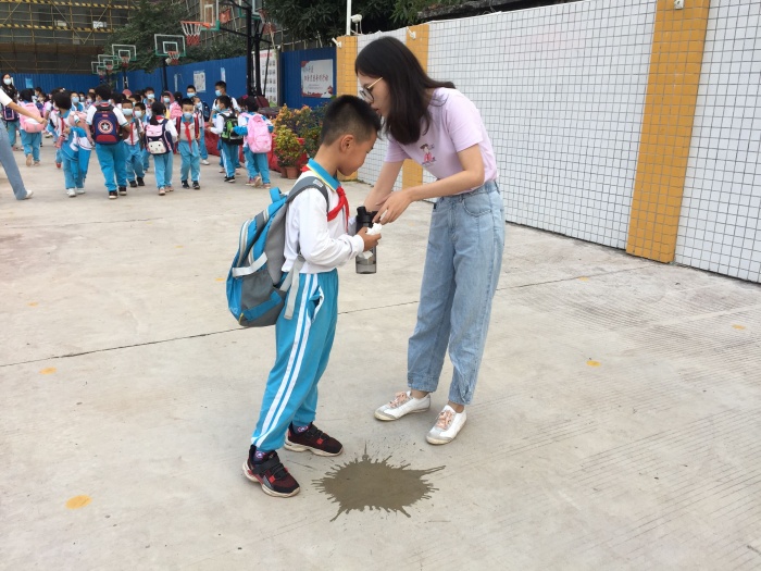 值日老師指引在校道放學的學生讓開一條通道,讓班主任帶嘔吐學生到隔離區等候,戴好手套幫學生測量體溫,隨即電話通知家長過來帶學生到醫院看病。同時,值日老師立馬打電話通知值日行政,值日行政再通知清潔阿姨馬上過來對嘔吐物進行清理消毒。學校按照疫情防控工作專班的工作處置流程要求,逐級匯報。學校相關領導和部門迅速響應,啟動應急預案,按流程處置。這次應急演練,學校各成員職責明確、流程清晰、協同有力、處置得當,達到了預期效果。