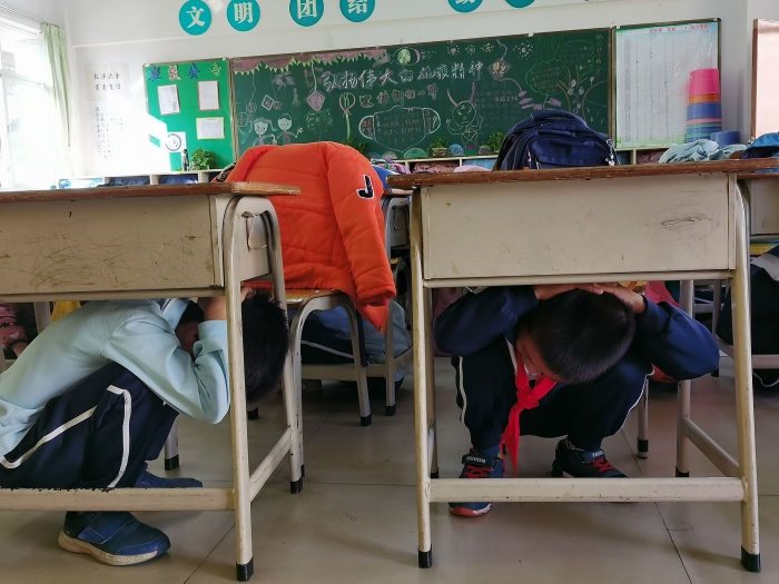 上午9:00,隨著第一聲警報的響起,全校師生迅速進(jìn)入應(yīng)急狀態(tài)。任課老師帶領(lǐng)學(xué)生就近蹲于課桌下面,蜷曲身體護(hù)住頭部,想辦法保護(hù)自己的身體。等聽到第二次警報聲響起,同學(xué)們在任課老師和安全崗老師的引導(dǎo)下,彎著腰,有序、快速地撤離教室,按預(yù)案規(guī)定的疏散路線撤離到學(xué)校操場。整個演練過程中老師和同學(xué)們臨危不亂,組織有序,逃生時沒有發(fā)生擁擠、踩踏和碰傷學(xué)生的事故。