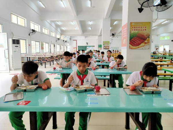午餐時間在上午的各種活動結束后悄然到來,學生在老師的帶領下嚴格按照“七步洗手法”排隊洗手,錯時錯峰分區域洗手,有序就餐。