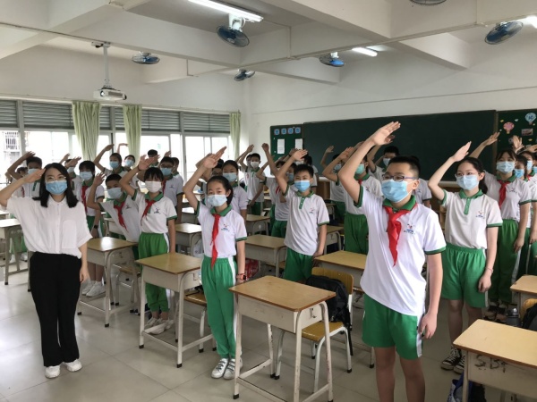 上午10:40,國旗伴隨著響亮的國歌聲徐徐升起。為了避免學生扎堆聚集,學校只安排了兩個班的孩子和行政一起在操場上舉行升旗儀式,其他同學都在教室里進行。雖不在升旗現場,但孩子們用自己熾熱的目光注視著教室正前方的國旗,雄壯的國歌、筆直的身姿、標準的隊禮,無一不彰顯孩子們對祖國的熱愛和對校園的想念。