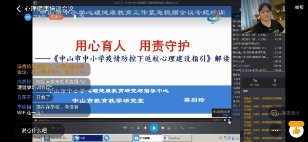 本次直播培訓的內容豐富,馮主任首先說明了學生返校在即,全體教師都要高度重視學生返校心理建設,強調了對孩子返校心理建設是學校近期工作的重點,與每一個老師密切相關,號召全體教師共同學習,齊心合力開展好學生的返校心理健康教育。接著馮主任傳達了《中山市中小學疫情防控下返校心理建設指引》的文件精神,并借助中山市教學研究室梁劍玲老師的《用心育人 用責守護》專題講座,讓全體老師認識到如何開展好疫情防控下的學生心理健康教育。