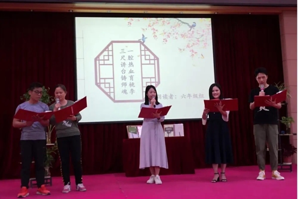 四月的校園春意盎然,處處彌漫著花兒的香氣。在鳥語花香的校園里,語文科全體老師分年級伴著優美動聽的音樂緩緩步入舞臺,開啟此次活動。此次朗讀內容包括歌頌祖國、致敬抗疫英雄和禮贊教師三個方面,各個年級朗誦篇目分別為:《月光下的中國》《祖國啊!我親愛的祖國》《你的樣子》《武漢,春天就在你的下一次呼吸里》《思念園丁》《一腔熱血育桃李,三尺講臺鑄師魂》。禮堂里的朗讀聲時而磅礴大氣,時而婉轉流暢;時而輕柔傾訴,時而激昂奔放;時而涓涓細語,時而豪情壯志;時而低沉悲愴,時而高亢歡快。老師們用飽滿的熱情和富有詩意的語言詮釋了本次活動的主題——為愛朗讀。