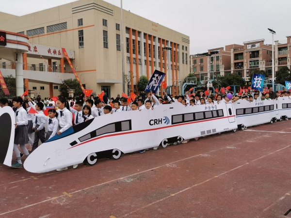 歷經(jīng)數(shù)周的操練,終于迎來(lái)檢閱時(shí)刻。鏗鏘的步伐,整齊的口號(hào),這是一場(chǎng)實(shí)力的較量,更是創(chuàng)意的集錦。本次運(yùn)動(dòng)會(huì)出場(chǎng)儀式一改往年以班級(jí)為單位出場(chǎng)模式,采用年級(jí)為單位,進(jìn)行主題化展演,氣勢(shì)更加恢弘!一年級(jí)方陣以“教育文化”為主題,孩子身著漢服,充滿了儒家氣質(zhì),宛如一個(gè)個(gè)穿越而來(lái)的小學(xué)士,為大家唱響《中國(guó)字中國(guó)人》。二年級(jí)方陣在一堆彩色氣球的簇?fù)硐峦白邅?lái),他們的主題是“生態(tài)環(huán)境”,伴隨著《七色光》的音樂(lè),孩子們用舞蹈展示童心筑就彩色校園,文明呵護(hù)綠色地球。三年級(jí)方陣以“時(shí)代風(fēng)采”為主題,伴隨著嘹亮的愛(ài)國(guó)音樂(lè),學(xué)生們將摩天大樓、高速鐵路、載人飛船、航空母艦等劃時(shí)代的元素搬上了舞臺(tái),采用造型變化方式,展示了新中國(guó)成立70周年以來(lái)的時(shí)代變遷;四年級(jí)方陣進(jìn)行的是科技現(xiàn)代化的展示,一輛巨大的和諧號(hào)動(dòng)車乘載著全體四年級(jí)學(xué)生壯麗出場(chǎng),他們還給大家?guī)?lái)了精彩的七彩金花操表演;五年級(jí)方陣以“國(guó)防軍事”為主題,展示的是軍體拳展演。整齊統(tǒng)一的動(dòng)作,聲音嘹亮的口號(hào),都在向大家展示著祖國(guó)國(guó)防軍事的強(qiáng)大。六年級(jí)方陣以“體育文化”為主題,給大家?guī)?lái)的是流行舞蹈。孩子們用舞姿傳遞著體育精神,傳遞著對(duì)母校的不舍。六年級(jí)老師們的舞蹈亮相更是驚艷全場(chǎng),引來(lái)全場(chǎng)歡呼,將開(kāi)幕式推向高潮。各具特色的創(chuàng)意,盡顯靈動(dòng)、大氣、震撼,感染了在場(chǎng)所有的學(xué)生、家長(zhǎng)以及嘉賓。