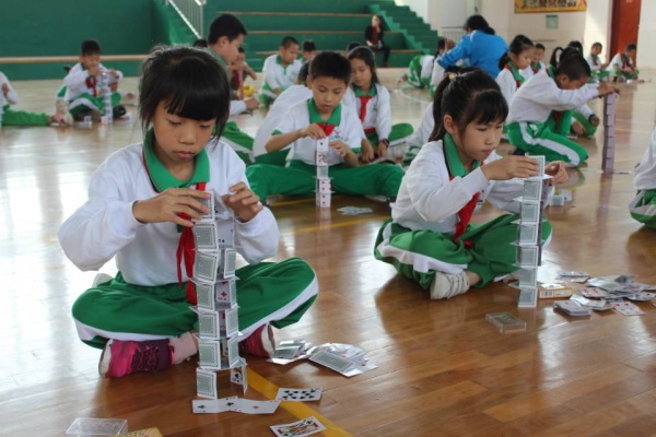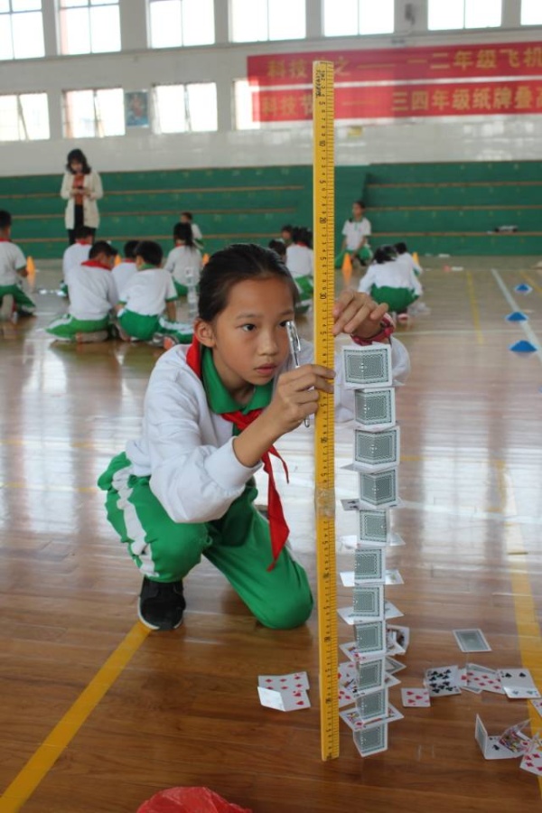 針對學(xué)生的年齡特點(diǎn),比賽分低、中、高三個(gè)學(xué)段來進(jìn)行。其中,一二年級舉行的活動是手?jǐn)S紙飛機(jī),飛向科技的殿堂。孩子們帶來了親手設(shè)計(jì)的紙飛機(jī),他們那信心十足的神情,躍躍欲試的姿態(tài),讓比賽現(xiàn)場變得歡快起來。在裁判的組織下,孩子們用有力的臂膀放飛手中的紙飛機(jī),放飛他們美好的飛天夢。三四年級開展了紙牌搭高活動,裁判一聲令下,場上馬上沸騰了起來。孩子們通過巧手搭起奇妙的高塔,感受科技的魅力。五六年級舉行了“雞蛋撞地球”的比賽,當(dāng)參賽者們的作品一個(gè)一個(gè)丟下來的時(shí)候,所有同學(xué)們的心都被牽動著,同學(xué)們有時(shí)因?yàn)椤半u蛋”安全著陸而歡呼鼓掌,有時(shí)因?yàn)樽髌返钠孑馑悸范_懷大笑,有時(shí)因?yàn)殡u蛋碎裂而嘆息。這一挑戰(zhàn)不但給同學(xué)們提供展示風(fēng)采的舞臺,還帶來了無限歡樂。