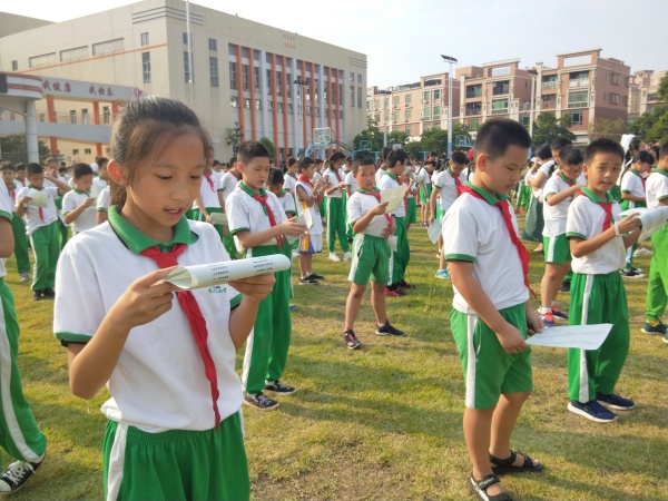 “五星紅旗迎風飄揚,勝利歌聲多么響亮,歌唱我們親愛的祖國,從今走向繁榮富強……”伴隨著《歌唱祖國》的動人旋律,整個校園里回蕩著歌聲。原來今年是中華人民共和國成立70周年,為弘揚愛國主義精神,增強同學們熱愛祖國情懷,港口鎮中心小學9月23日下午舉行千人齊唱愛國歌曲活動,向新中國成立70周年獻禮。