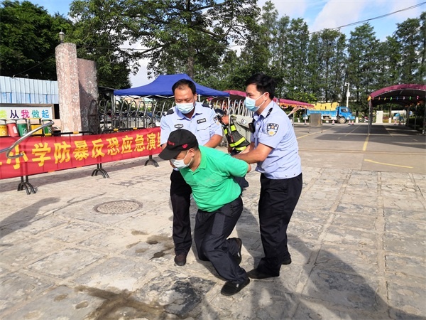 在防暴反恐應急演練開始前,德育處主任梁耀昌先對全校師生進行了防暴反恐安全知識教育,讓師生明白防暴反恐的重要性,指導師生在面對歹徒時要保持鎮靜、聽從指揮、安全躲藏等,并告知學生謹記報警電話110,急救電話120。梁主任還強調,老師們要履行教師職責,堅守崗位,保護學生。