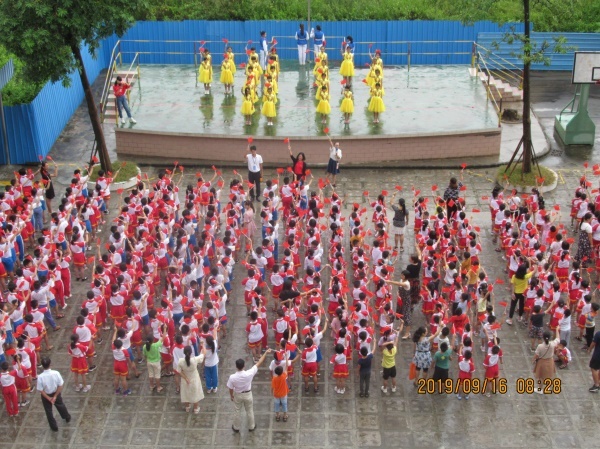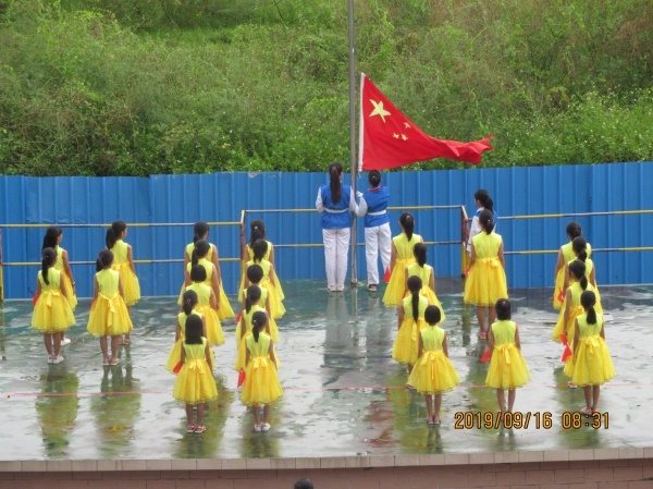 伴隨著《我和我的祖國(guó)》音樂(lè)的響起,全校師生揮動(dòng)著小國(guó)旗,邊走邊唱:“我和我的祖國(guó),一刻也不能分割,無(wú)論我走到哪里,都留下一首贊歌……”學(xué)生們洋溢著笑容,用歌聲詮釋著對(duì)祖國(guó)深情的愛(ài)。升旗臺(tái)旁還有32位學(xué)生盛裝打扮,站成“70”隊(duì)形,寓意中華人民共和國(guó)成立70周年。初升的太陽(yáng)使得 “70”隊(duì)形顯得格外耀眼奪目。