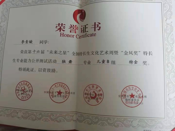 據悉,群眾小學重視培養德、智、體、美、勞全面發展的學子,注重藝術教育,積極推進藝術教育工作,努力提高學子的藝術素養。李青璇同學榮獲特金獎這一殊榮,彰顯出群眾小學全體師生積極進取、為校爭光的精神風貌,展現了群眾小學師生良好的審美情操!