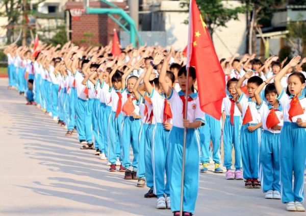 當清晨的第一縷陽光灑入群眾小學,主持人宣布升旗儀式正式開始。迎著朝陽,國旗護衛隊邁著整齊劃一的步伐走來,目光堅定、身姿挺拔。在全場注目禮下,國歌聲響起,少先隊員敬隊禮,全場齊唱國歌……五星紅旗冉冉上升,與蔚藍的天空相輝映,展露一抹熱血的中國紅。