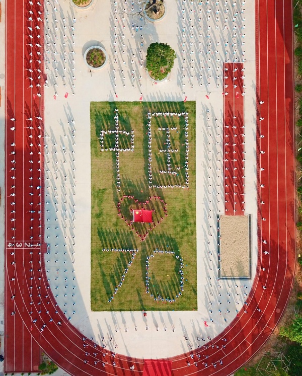 緊接著,在“我和我的祖國,一刻也不能分割……”的歌聲中,學生們在操場上擺出“中國”和“70”的字樣,并緩緩舉起一面巨大的五星紅旗,讓五星紅旗在操場上迎風飄揚。全校師生揮舞著手中的小國旗,共同唱響《歌唱祖國》,將整個活動推向了高潮,校園里如同一片“紅色海洋”,洋溢著滿滿的愛國情懷。最后,伴隨著激昂的旋律,全校師生在大隊輔導員胡嬋媛老師的帶領下,在國旗下高呼“祖國萬歲!祖國萬歲!”。群眾小學全體師生為祖國送上最美好的祝福,共同祝福祖國繁榮昌盛!