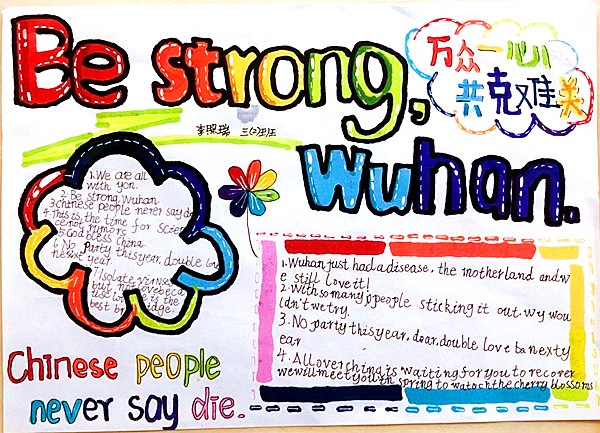 疫情無情,人間有情。全體同學(xué)積極參與,在英語(yǔ)老師的指導(dǎo)下,認(rèn)真搜集資料、素材,在家中發(fā)揮奇思妙想,繪制出了一幅幅設(shè)計(jì)獨(dú)特、圖文并茂,并浸潤(rùn)了無限愛心的手抄報(bào),充分展現(xiàn)了對(duì)疫情的熱切關(guān)注,對(duì)英語(yǔ)學(xué)習(xí)的無限熱情,同時(shí)也體現(xiàn)了他們對(duì)打贏這場(chǎng)戰(zhàn)役的堅(jiān)定信心。同學(xué)們?cè)谟昧λ芗暗姆绞剑瑐鞑ブ啻赫芰浚莱鰧?duì)美好生活的期待。為了讓同學(xué)們的成果得到更多的展示和肯定,英語(yǔ)科組的老師們?cè)u(píng)選出了本次比賽的一等獎(jiǎng),分別是三(1)班鐘柏希、四(2)班代悅、五(2)班陳玉婷以及六(2)班黃詩(shī)思。
