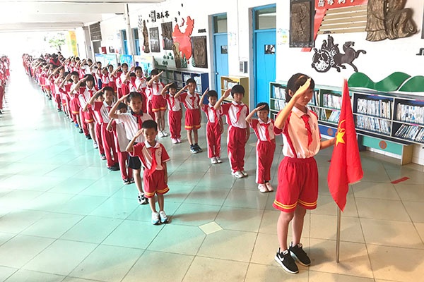 6月8日下午三點,隨著一聲“全體立正,出旗!敬禮!”的指令,少先隊隊旗手精神抖擻地邁著莊嚴而有節奏的步伐走來。在火紅的隊旗下,在星星火炬的指引中,全體少先隊員高唱《中國少年先鋒隊隊歌》。嘹亮的歌聲,唱出了每位同學心中的自豪與驕傲。大隊輔導員黃施雅老師宣讀了新隊員名單。瞧,同學們滿臉的笑容,激動的內心,老隊員為系好紅領巾的那一刻,是多么的神圣和富有使命感!接下來,黃老師帶領所有的隊員在隊旗下莊嚴宣誓,準備著為共產主義事業貢獻力量!