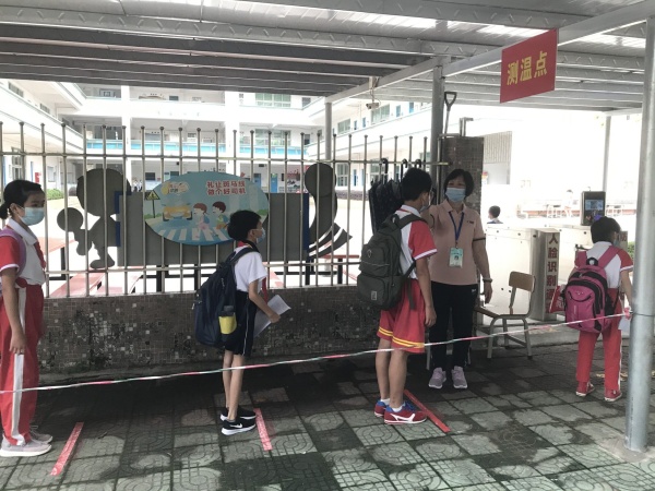 因學校采取了分批錯時入校的措施,學生有序進入校園,通過雙手消毒、體溫測量等一系列步驟下來,均能有條不紊。班主任在教室門口對學生進行第二次的體溫測量并登記之后,便和學生一起拉開了新學期開學典禮的帷幕。