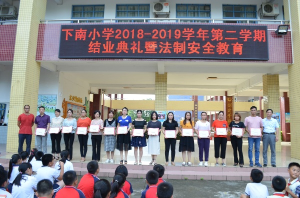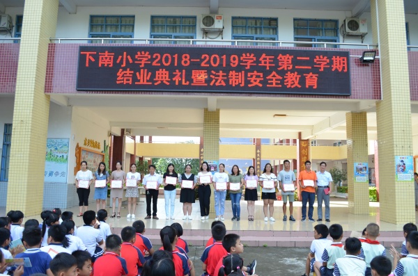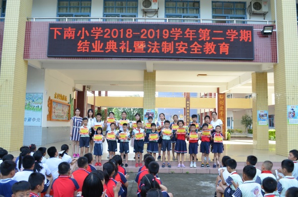 7月5日上午8:00,港口鎮下南小學在學校前操場舉行了2018-2019學年第二學期結業典禮暨法治安全教育課,學校行政、全體師生以及部分家長參加了本次典禮。