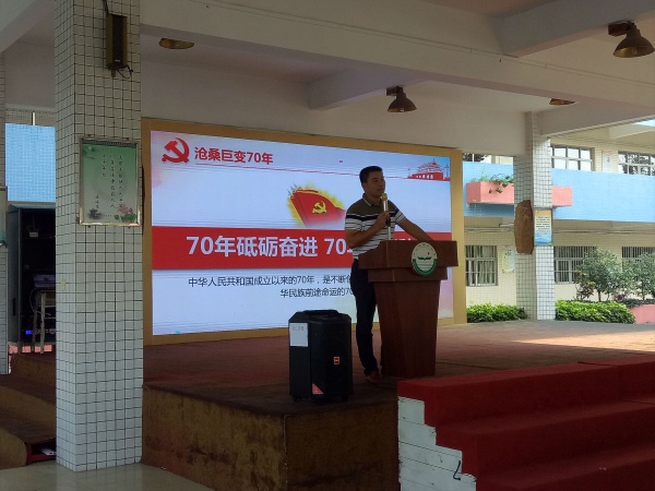 為喜迎中華人民共和國成立70周年,讓師生感受祖國走過的70年來的滄桑巨變,加強師生的愛國情懷,培養(yǎng)珍惜當下、奮發(fā)圖強、與祖國共同成長的思想意識,學校黨支部書記管德豐同志于9月23日下午在學校大廳召開了“70年砥礪奮進 70年春華秋實”的主題講座,給初一師生講述了祖國成長歷程中的可喜變化。