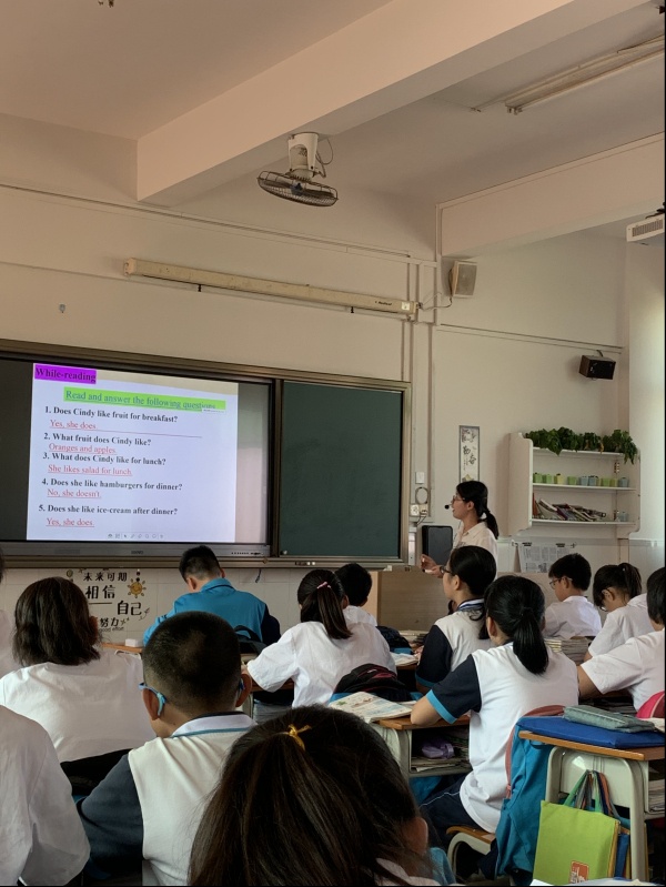 在英語聽說課上,熊芬老師采用了觀看視頻、圖片展示、播放音頻、小組游戲等多樣化教學方式,激起學生學習興趣,從語言輸入到語言產出,學生參與度極高,課堂十分活躍,整體呈現了一堂生動高效靈動課堂。