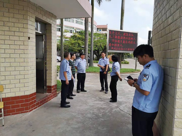 為了確保中秋、國慶兩節安全穩定,促進校園安全防范工作 ,2019年9月11日上午,民眾鎮公安分局治安大隊以及港口鎮大南派出所林權明警官等一行7人來到港口鎮大南中學督導校園安全工作,大南中學校長張育文、副校長廖建紅等行政干部及安保人員陪同檢查。