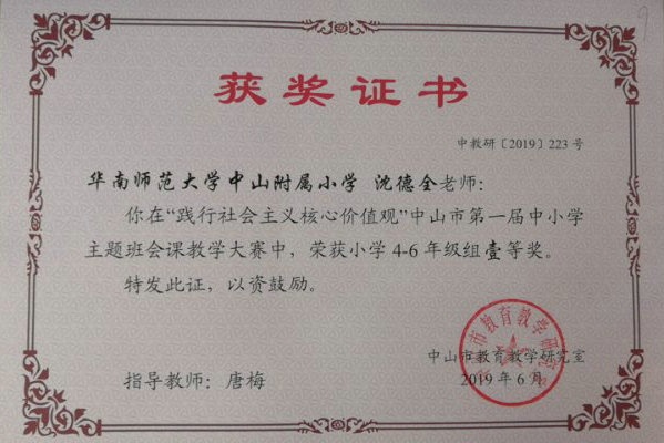 華師中山附小沈德全老師在市第一屆主題班會課大賽榮獲一等獎發(fā)布時間:2019-06-28 16:48 信息來源:本網(wǎng)站 瀏覽次數(shù):24