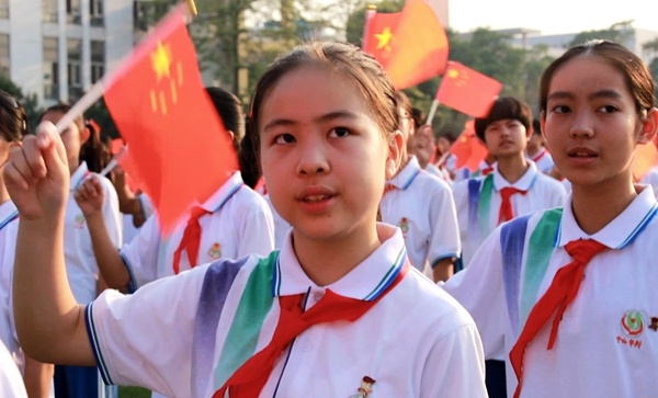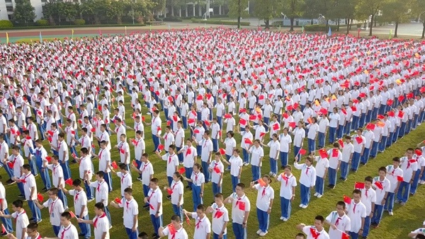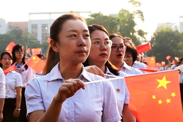 之后,全校師生齊聲共唱愛國歌曲《大中國》和《歌唱祖國》,當經典的旋律響起,熟悉的歌聲瞬間在校園唱響,7000余名師生手揮五星小紅旗,一時間成為校園最激動人心的場景。