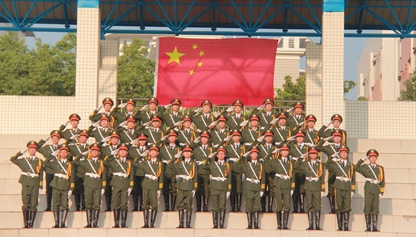 伴隨著歌唱祖國雄壯的音樂,國旗班的同學身著儀仗禮服,邁著整齊的步伐,雄糾糾,氣昂昂,護送國旗走上升旗臺。在雄壯激昂的國歌聲中,鮮艷的五星紅旗、在7000多雙眼睛的注視中冉冉升起。當國旗展開的時候,師生的激情在胸中蕩漾、民族自豪感油然而生。