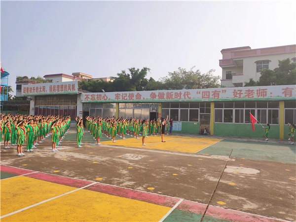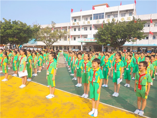 接下來進行了“紅領(lǐng)巾與祖國共成長——紀(jì)念中國少年先鋒隊成立70周年暨喜迎少先隊廣東省第七次代表大會”少先隊微儀式統(tǒng)一行動。全體少先隊員面向隊旗做到了“四個一”:敬一個隊禮、唱一次隊歌、重溫一次誓詞、莊嚴(yán)呼號一次。出隊旗、敬隊禮,全體隊員右手五指并攏,高舉頭上,一個個標(biāo)準(zhǔn)的隊禮,展現(xiàn)出少先隊員積極向上的精神風(fēng)貌。緊接著,輔導(dǎo)員鐘鳳怡老師帶領(lǐng)全體隊員合唱《中國少年先鋒隊隊歌》,嘹亮的歌聲響徹校園。隨后,優(yōu)秀少先隊員五(2)中隊孫越同學(xué)代表全體少先隊員在國旗下講話并宣誓:珍惜時間,努力學(xué)習(xí),時刻準(zhǔn)備著為共產(chǎn)主義事業(yè)而奮斗。最后在大隊輔導(dǎo)員鐘鳳怡老師的帶領(lǐng)下,全體隊員重溫了入隊誓詞并呼號,“時刻準(zhǔn)備著”隊員們的回答鏗鏘有力、氣勢昂揚。