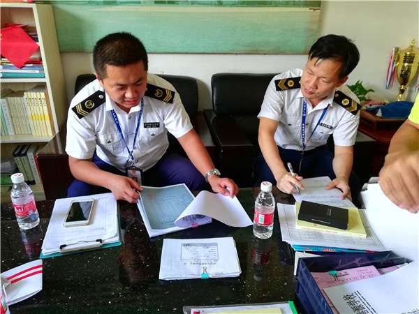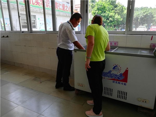 2019年9月11日上午,港口鎮食品藥品監督所孫思燕專干等一行四人來到港口港源學校食堂檢查食品安全工作。劉琳校長和總務主任謝柏高共同迎接了檢查組一行人。