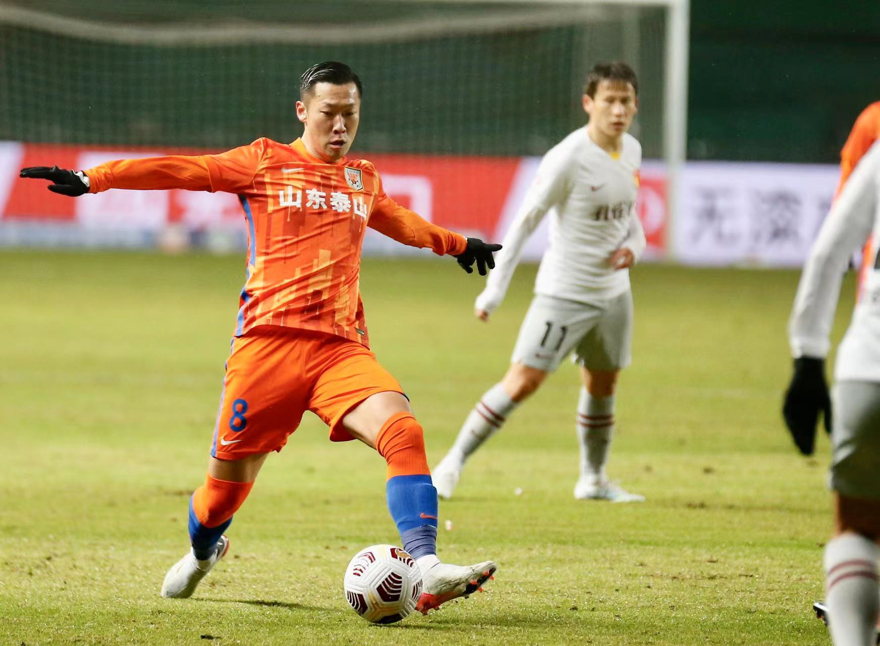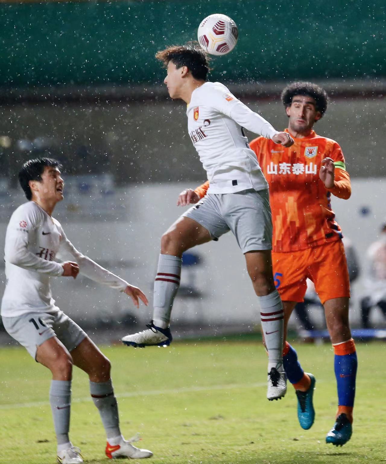 開場后前20分鐘,山東泰山雖然攻勢占優(yōu),但并沒有太多很好的得分機(jī)會,河北小將們用沖勁與對手周旋。