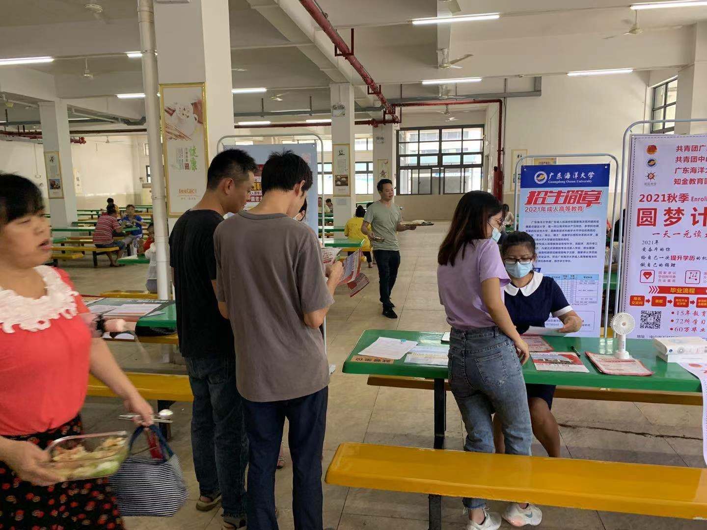 中午時分,不少的工廠員工來到飯堂吃飯,而“圓夢計劃”的繼續教育宣傳報名點,就設置在飯堂的入口。“1天1元讀大學”的標語,讓不少路過的人,都來到報名點了解,阿霞就是其中一個。