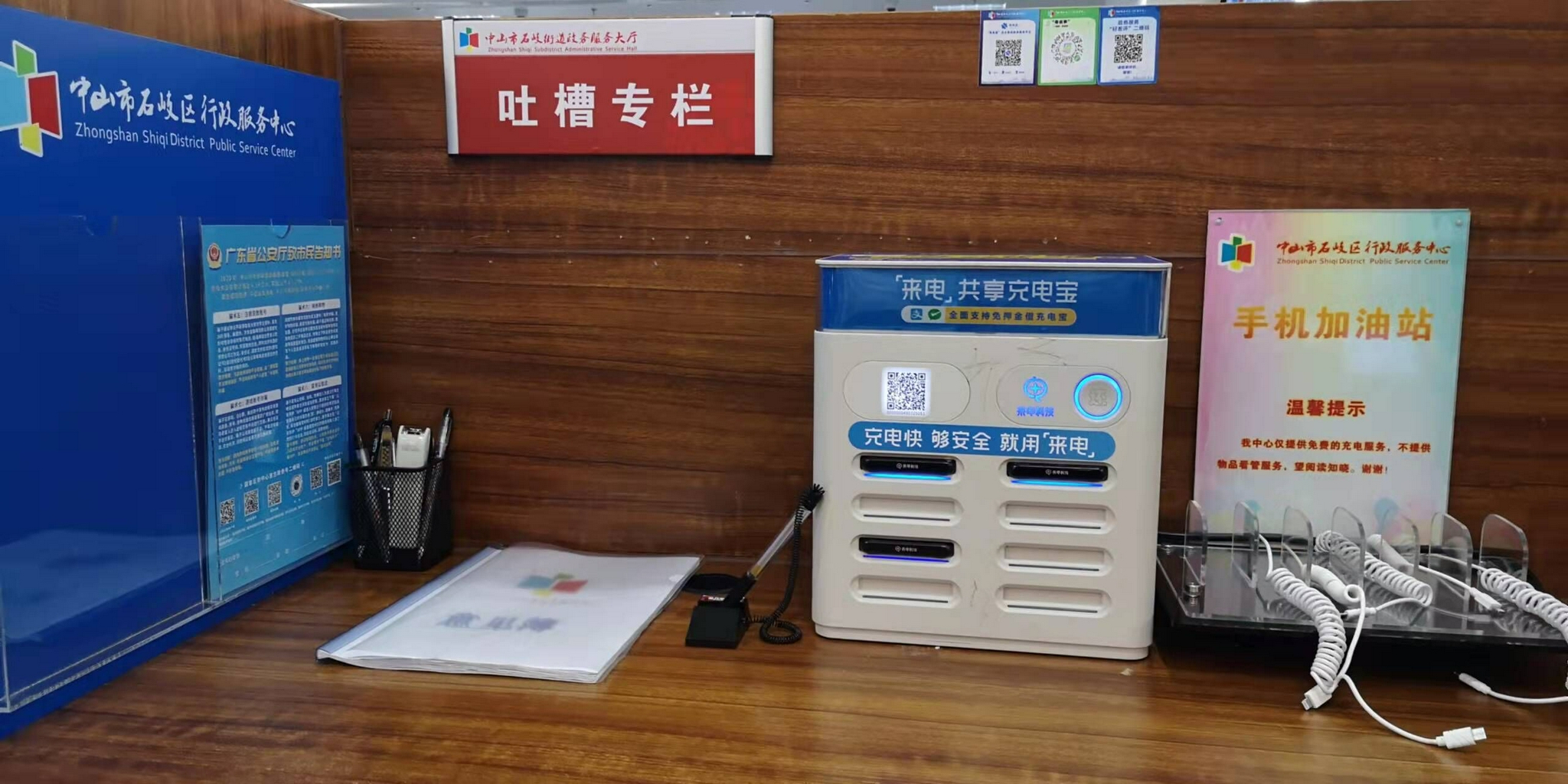 在石岐街道政務服務大廳入口處的咨詢臺,擺放著一個非常醒目的標志牌“我要吐槽窗口”。