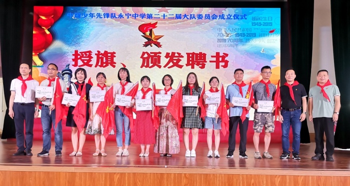 9月8日下午,為進(jìn)一步加強(qiáng)對(duì)學(xué)校少先隊(duì)工作的領(lǐng)導(dǎo),永寧中學(xué)團(tuán)委按照“黨建帶團(tuán)建,團(tuán)建帶隊(duì)建”的工作思路,培養(yǎng)少先隊(duì)員的主人翁意識(shí),在學(xué)校體育館隆重舉行了中國(guó)少年先鋒隊(duì)永寧中學(xué)第二十二屆大隊(duì)委員會(huì)成立暨新生、志愿者宣誓儀式。參加儀式的有陳清茂校長(zhǎng)、陳華梁副校長(zhǎng)、楊青華副校長(zhǎng)等校領(lǐng)導(dǎo)和初一年級(jí)全體師生。