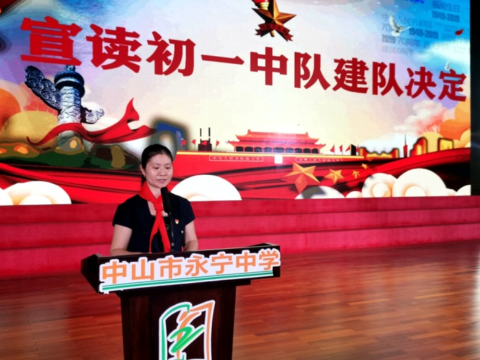 大會(huì)在雄壯的國(guó)歌聲中拉開帷幕。首先,由大隊(duì)輔導(dǎo)員羅結(jié)晶副主任宣布初一年級(jí)建隊(duì)決定和中隊(duì)輔導(dǎo)員名單,并由陳清茂校長(zhǎng)、陳華梁副校長(zhǎng)、楊青華副校長(zhǎng)為中隊(duì)輔導(dǎo)員授中隊(duì)旗并頒發(fā)聘書。