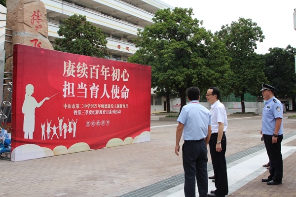 活動一:市領導蒞臨中山二中開展教師節慰問活動。9月10日上午,中山市副市長魯罡一行蒞臨中山二中開展教師節慰問活動。魯罡副市長走訪校園,視察校園基建工程,聽取中山二中黨委書記、校長吳祥明同志對學校歷史沿革、校史校情、二中近年發展情況的講解和匯報。黃圃鎮黨委書記梁泳輝,黃圃鎮黨委委員、市公安黃圃分局局長沈淼陪同慰問。
