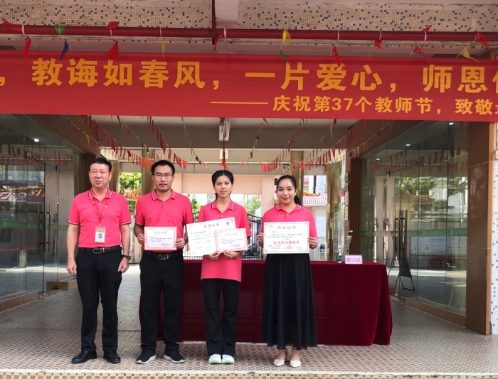 大會第二項,政教處陳七靈副主任宣讀了表彰的中山市優秀教師及中山市優秀少先隊輔導員,劉品江校長與何元柱副校長為他們頒發了榮譽證書。