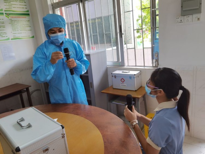 上午9:30,演練正式開始。其中著重演練課中突發(fā)事件的情景令人印象深刻,各位老師都投入到安排好的角色中。上課期間,一名學(xué)生報告老師不舒服,有咳嗽和嘔吐癥狀。上課老師隨即指揮班干部轉(zhuǎn)移其他學(xué)生,通知醫(yī)學(xué)觀察老師處理。該生來到留觀室醫(yī)學(xué)觀察老師初步了解生病學(xué)生的情況,了解其近14天內(nèi)流行病學(xué)史。