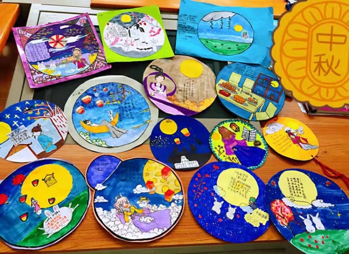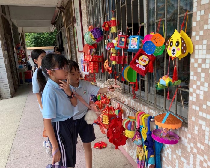 看,校園里張燈結(jié)彩,各式各樣的燈籠精彩紛呈,一片喜氣洋洋。有惟妙惟肖的動(dòng)物燈、紅紅火火的花燈,古色古香的水墨畫燈、色彩繽紛的繡球燈,甚至還有新年紅包做成的紅包等。除了制作燈籠,大涌南文小學(xué)的學(xué)生們還繪制了一大批色彩明艷、趣味十足的詩配畫作品。繪畫過程中,同學(xué)們暢談?dòng)嘘P(guān)中秋的習(xí)俗,把與中秋節(jié)相關(guān)的古詩結(jié)合著繪畫融入到一張張生動(dòng)的“詩配畫”中,讓大家一起了解嫦娥奔月,吳剛伐桂,玉兔搗藥等傳統(tǒng)佳話。同學(xué)們一起觀賞著眾人的佳作,時(shí)而雀躍,時(shí)而輕嘆,不時(shí)傳出陣陣歡呼和掌聲。