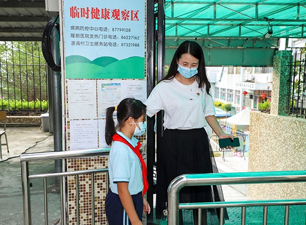 在入校情景演練中,學生按照學校規定的時間錯峰回校,進校門按要求前后間隔一米,刷臉測溫合格后有序進入教學樓。