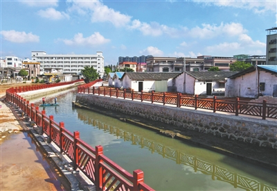 基尾涌兩岸紅色的護欄在秋日陽光照耀下格外醒目,水面寬闊波光粼粼,新砌的河堤擋墻整齊劃一。