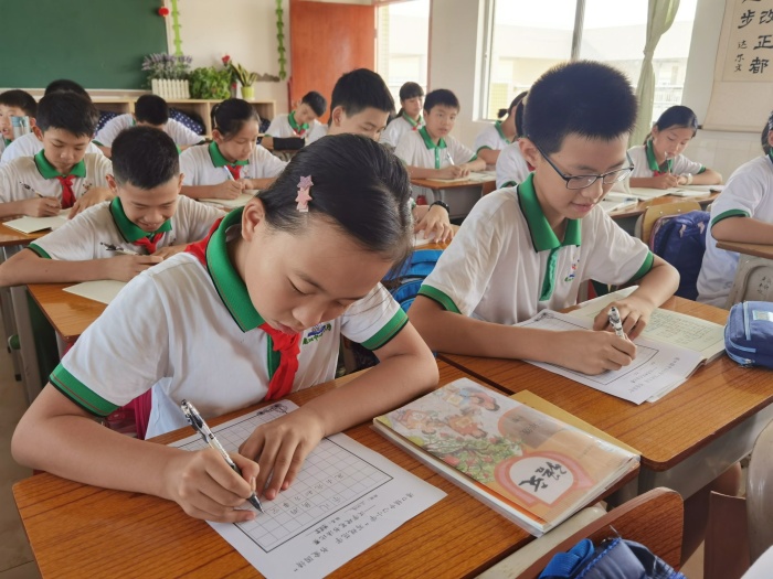 各年級也舉辦了特色鮮明的推廣普通話活動。一年級的小同學化身小老師,用標準的普通話向長輩們誦讀課文或講述生動有趣的故事,讓推普活動走進家家戶戶。二年級的紅領巾宣講員們同學們字正腔圓、聲情并茂地講述了英雄先烈們的英勇感人事跡,傳承紅色基因。三年級的同學們為推普活動設計了一幅幅版式精美的推廣普通話宣傳標語。四年級老師和同學們精心挑選誦讀內容進行誦讀經典詩文比賽。千年流傳的文化古韻,伴著稚嫩的聲音,為校園增添了濃厚的文化韻味。五年級開展了繪制“講普通話,寫規范字”手抄報比賽活動。同學們通過精美的手抄報,用實際行動響應祖國“推普”號召,抒發自己的愛國情!漢字硬筆書法比賽在六年級中開展。同學們筆尖流轉出一行行優美的漢字,在字里行間發現中華文字的魅力,發現中華文化的深厚內涵。