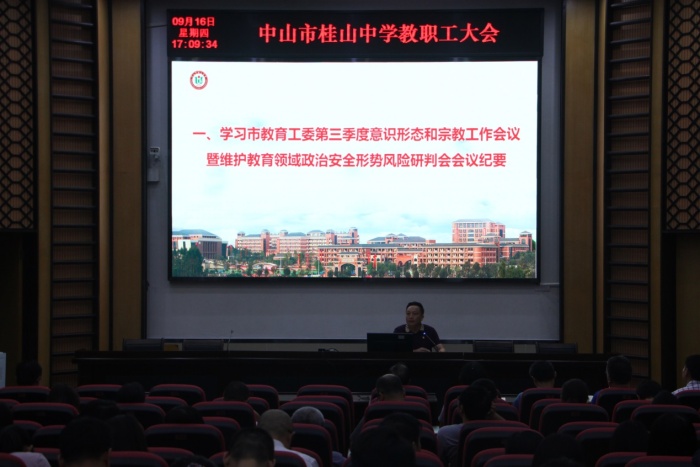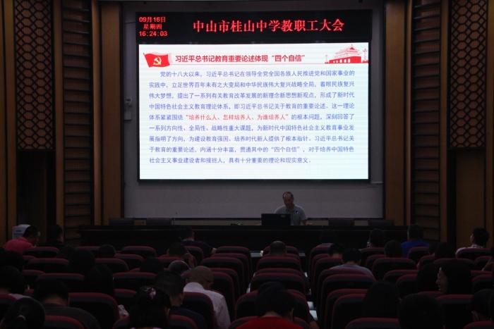 為持續深入學習領會習近平總書記“七一”重要講話精神,9月16日下午,桂山中學在德馨樓一樓報告廳開展主題黨課學習。主題黨課的主要學習內容是習近平總書記“四個自信”和“七一”重要講話精神中蘊含的“中國之治”與“中國之智”。主題黨課由學校黨委委員劉云平同志主持。