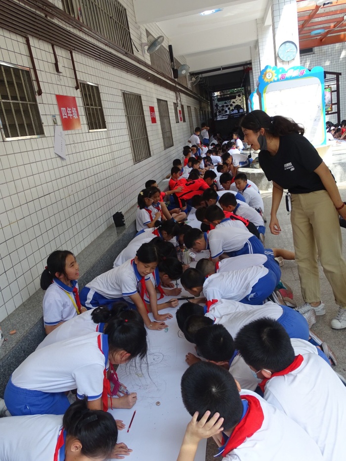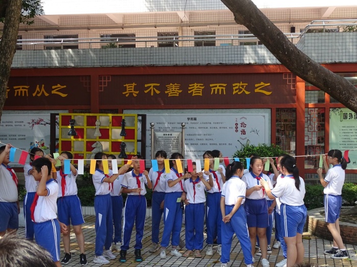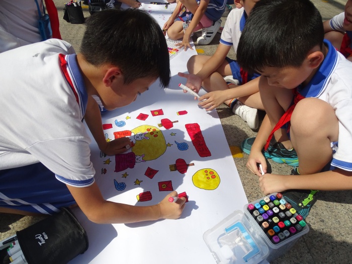 此次活動以周瑞珍校長為總指揮,德育處、教導(dǎo)處做好前期部署,不同年級分別開展不同的活動。一至三年級的學(xué)生變身小小藝術(shù)家,開動腦筋,親手制作一張張精美的紙盤創(chuàng)意繪畫,紙盤上有各種各樣的圖案,如嫦娥、玉兔、月亮等等,構(gòu)圖有趣,顏色鮮艷,一筆一畫充滿著濃濃的中秋情。四五年級的學(xué)生進行“百人畫長畫”活動,場面壯觀。學(xué)生想象豐富,以自己的視角,用小小的畫筆表達對中秋節(jié)深深的祝福!六年級的學(xué)生猜燈謎,校園內(nèi)的小操場、棋藝園內(nèi)懸掛著彩帶,100多條燈謎競相爭輝,謎面科學(xué)而通俗、生動而活潑,有猜字的、有猜成語的、有猜人名的、有猜地名的……燈謎涉及的面廣而量大。學(xué)生認(rèn)真思考,熱烈討論,紛紛猜對燈謎,兌換一份心儀的獎品。校園內(nèi)一片歡聲笑語,全校學(xué)生玩得不亦樂乎!
